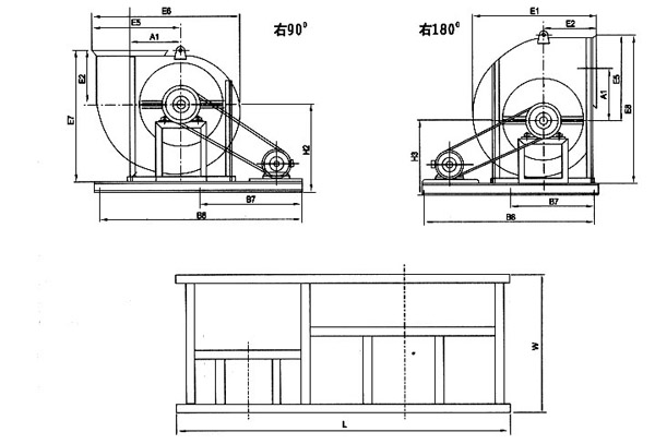 風機分左旋和右旋兩種型式,從電機(皮帶輪)側正視,葉輪按順時針方向旋轉為右旋,逆時針旋轉為左旋。A式為電機直聯傳動, B、C、E式為皮帶傳動,D、F式為聯軸器傳動。